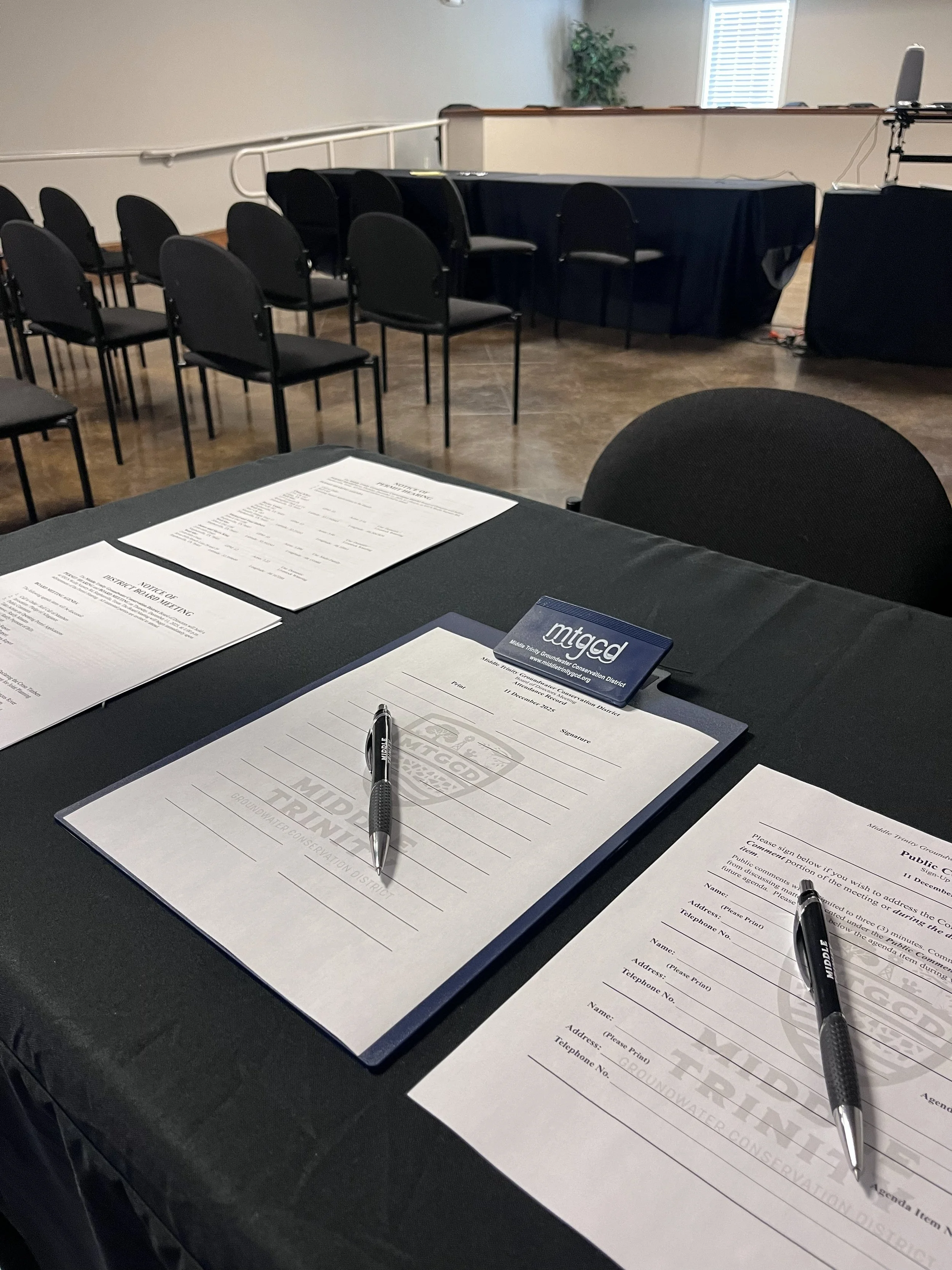The MTGCD Board of Directors holds regular monthly meetings and permit hearings on the first Thursday of each month at 1:00pm*. The public is encouraged to attend. The board meeting and permit hearing notices and agendas are posted on the door of the MTGCD office and on the District's website. The District's office is located at 930 Wolfe Nursery Road in Stephenville, Texas.