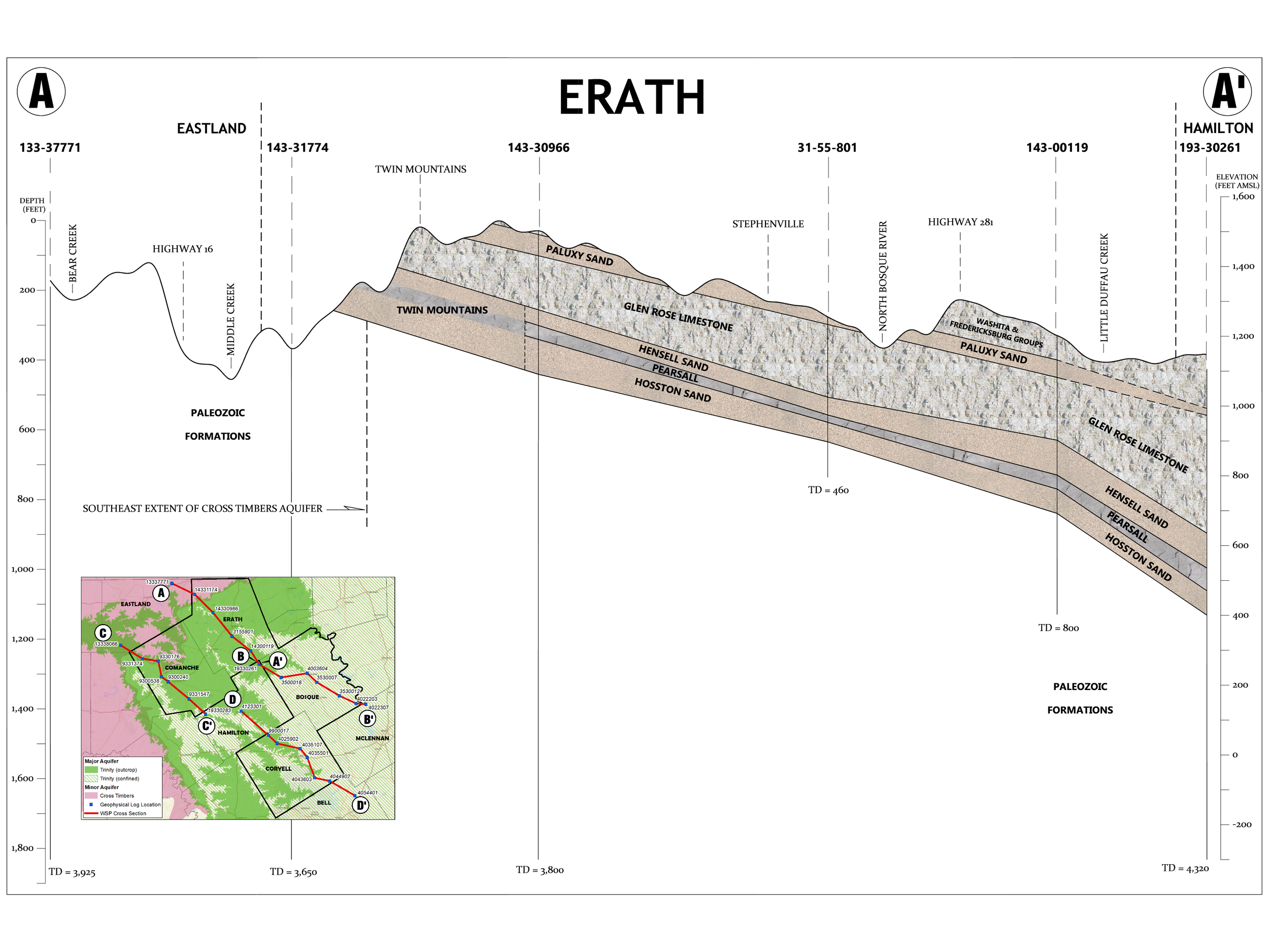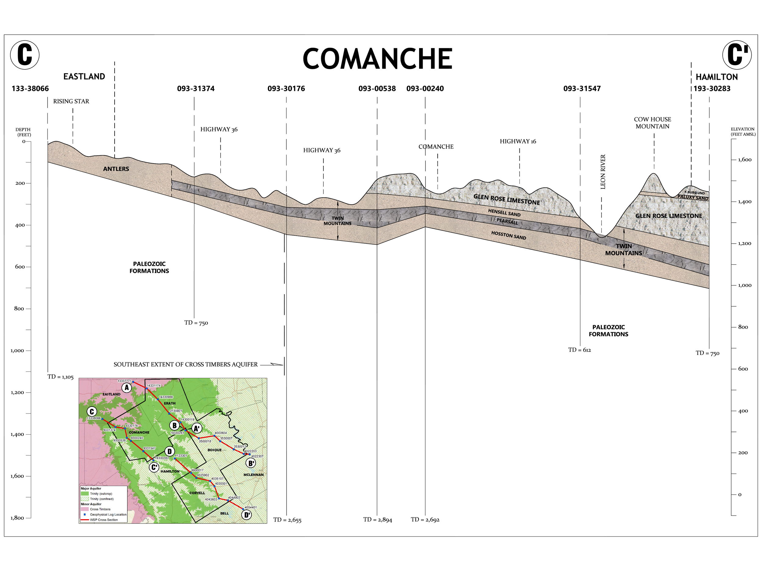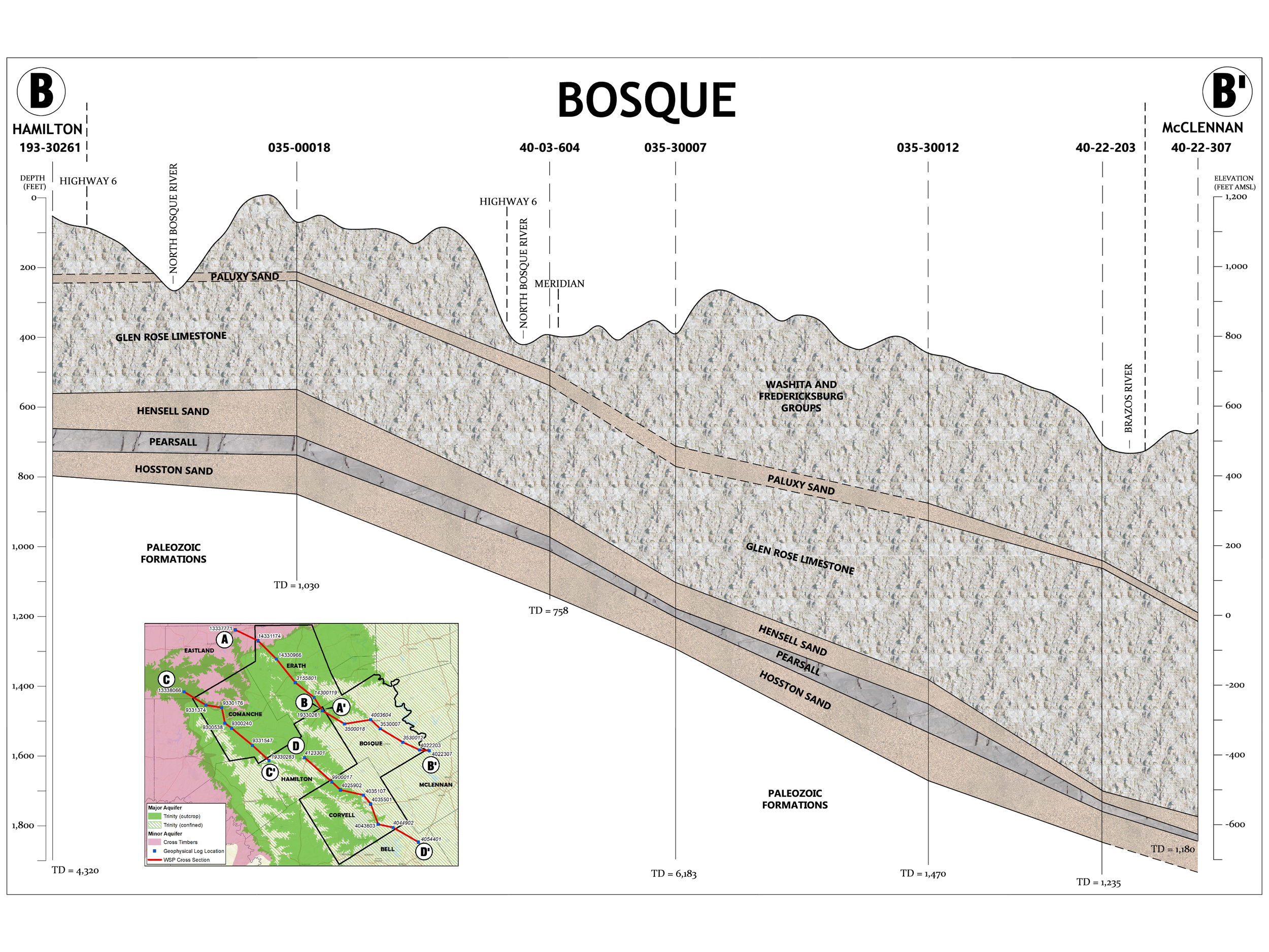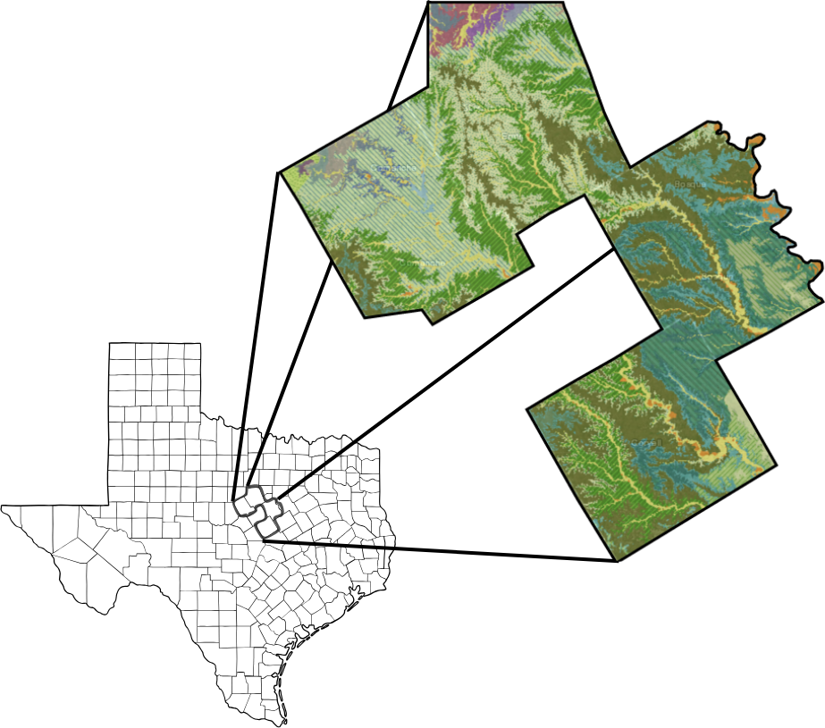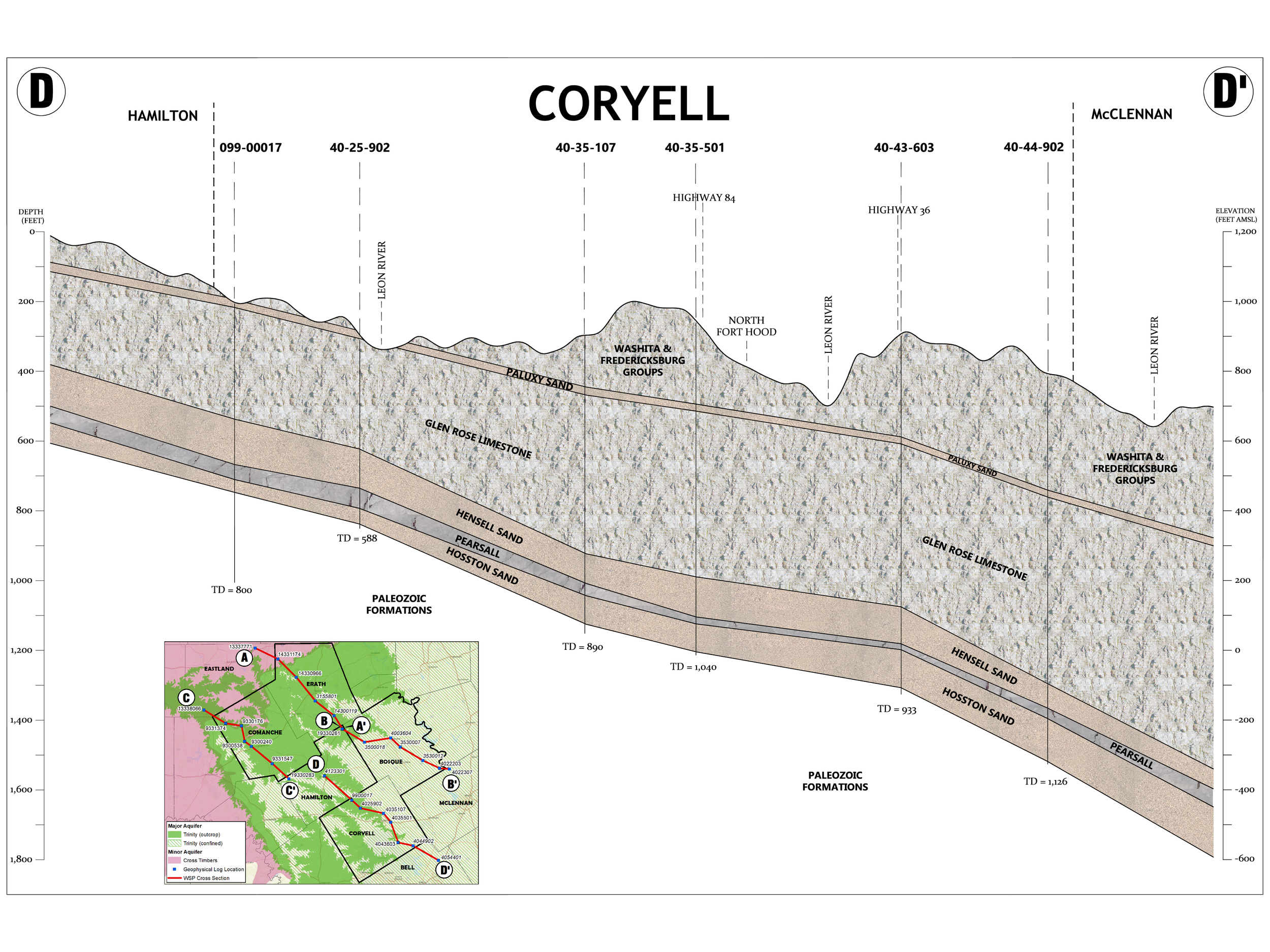 This diagram section uses simplified cross‑section drawings to show how the rock layers beneath each county are stacked, tilted, and connected, and how those layers make up the Trinity Aquifer system. By looking at these side‑view “slices” through the earth, you can see where key sands and limestones that hold groundwater are shallow, where they dip deeper, and how rivers and land surface features intersect them. Understanding how these rock layers are arranged helps explain why some wells are shallow while others must be drilled much deeper, and why water levels and water quality can change from one location to another, depending on which part of the Trinity Aquifer the well taps into. This visual context bridges the gap between basic geology and real‑world groundwater issues.